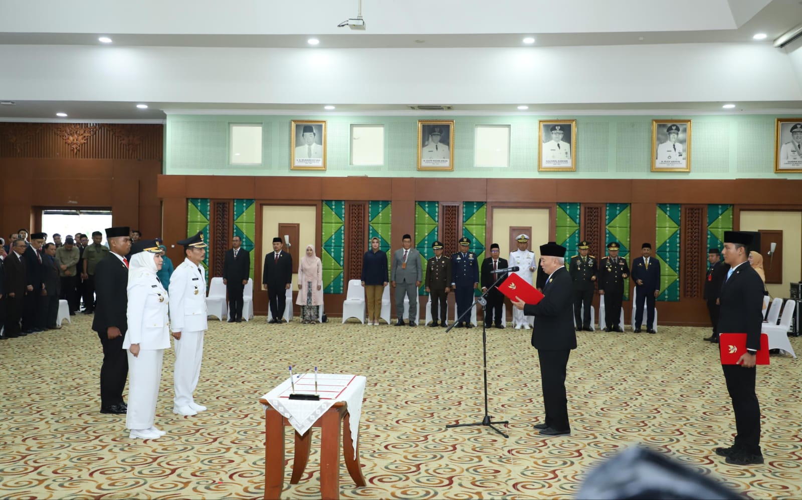 Diawali dengan pembacaan Surat Keputusan Menteri Dalam Negeri RI Nomor 100.2.1.3-2408/2025 tentang pengesahan penetapan pasangan terpilih hasil Pilkada 2024, prosesi pelantikan mencakup pengambilan sumpah jabatan serta penyematan tanda pangkat oleh Gubernur H. Muhidin kepada Erna Lisa Halaby dan Wartono.