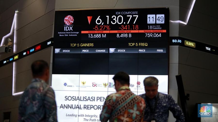 Berdasarkan data Bursa Efek Indonesia (BEI) pada perdagangan sesi pertama hari ini, IHSG ambrol 395,87 poin atau 6,12% ke level 6.076,08. Di level itu, IHSG sudah anjlok lebih dari 14,18% dari level penutupan pada akhir 2024 di posisi 7.079,9.