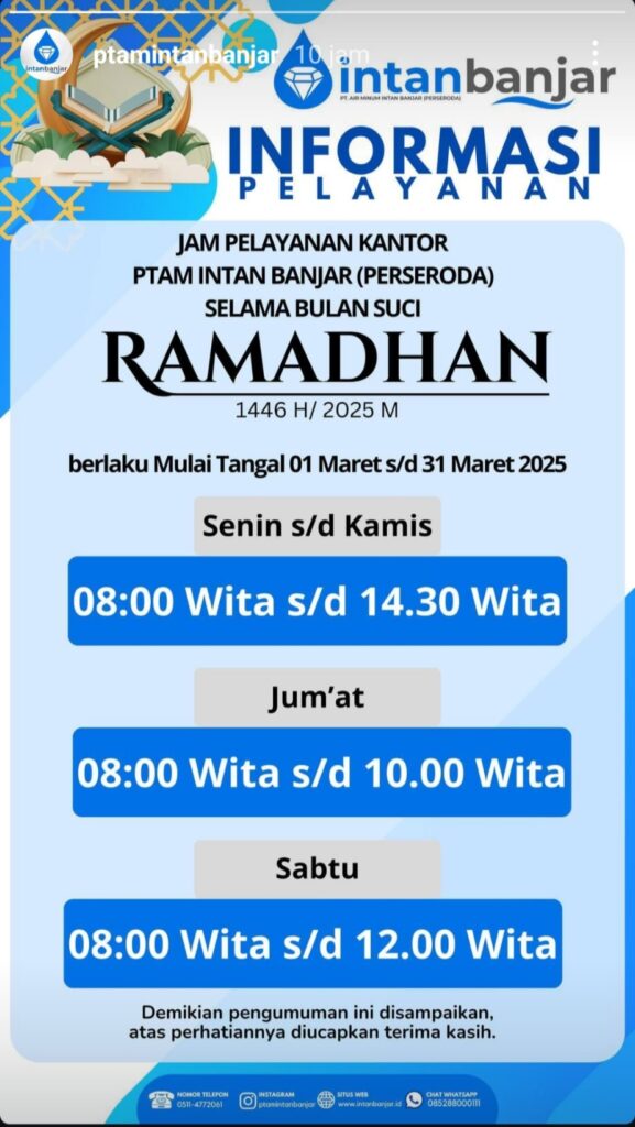 Dalam pengumuman yang disampaikan manajemen PTAM Intan Banjar di media sosial dijelaskan jam operasional pada Senin – Kamis dari pukul 08.00 Wita hingga 14.30 Wita.